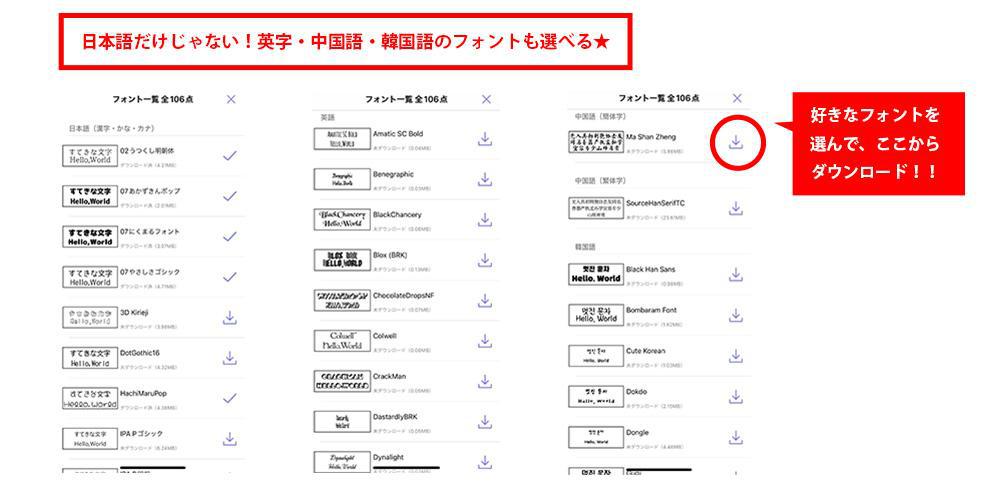 また、フォントは日本語だけでなく、英語や中国語、韓国語フォントもあるんです!