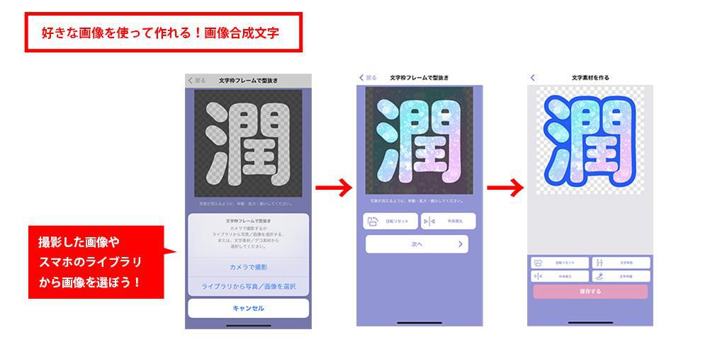 - 文字素材をフォント、カラー、縁取り、画像合成等で自分の好きなように作れる!