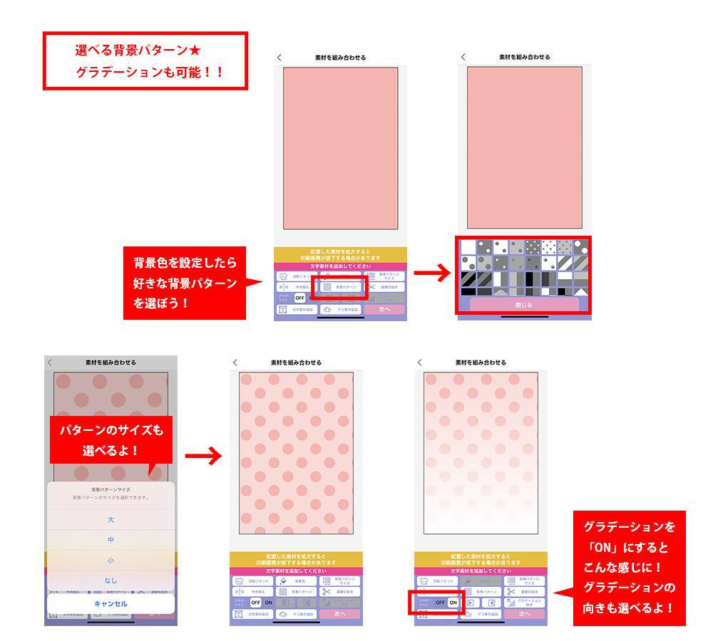 - 印刷シートでさまざまな背景パターンや画像配置、グラデーションができる!
