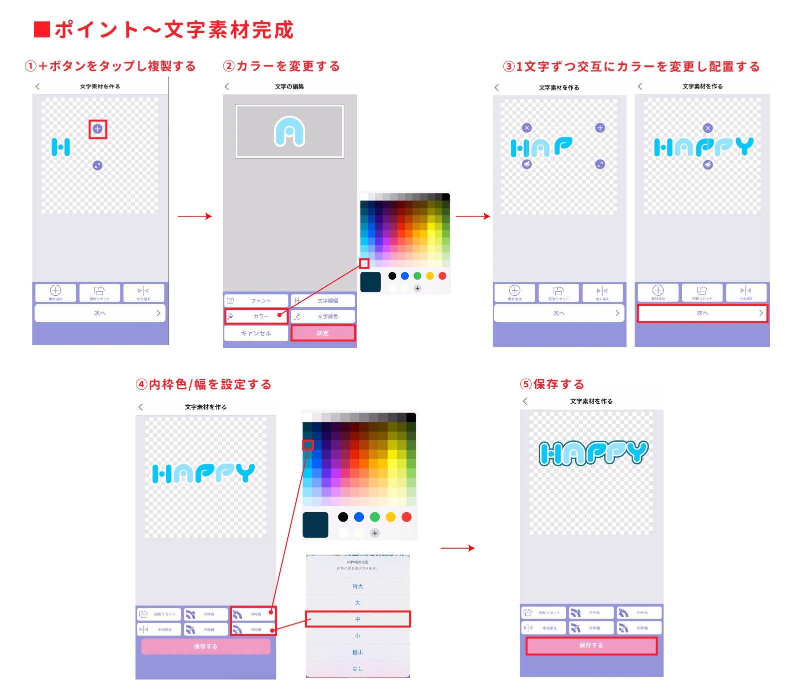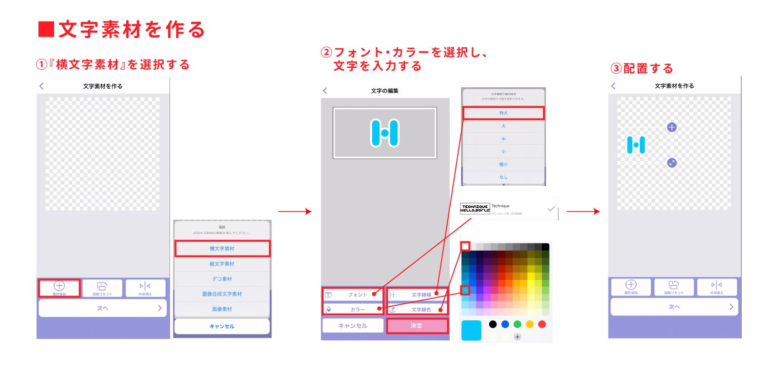 アプリのトップの「文字素材を作る」→「文字素材を作る」→編集画面にいきます。
