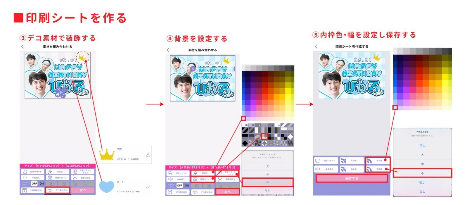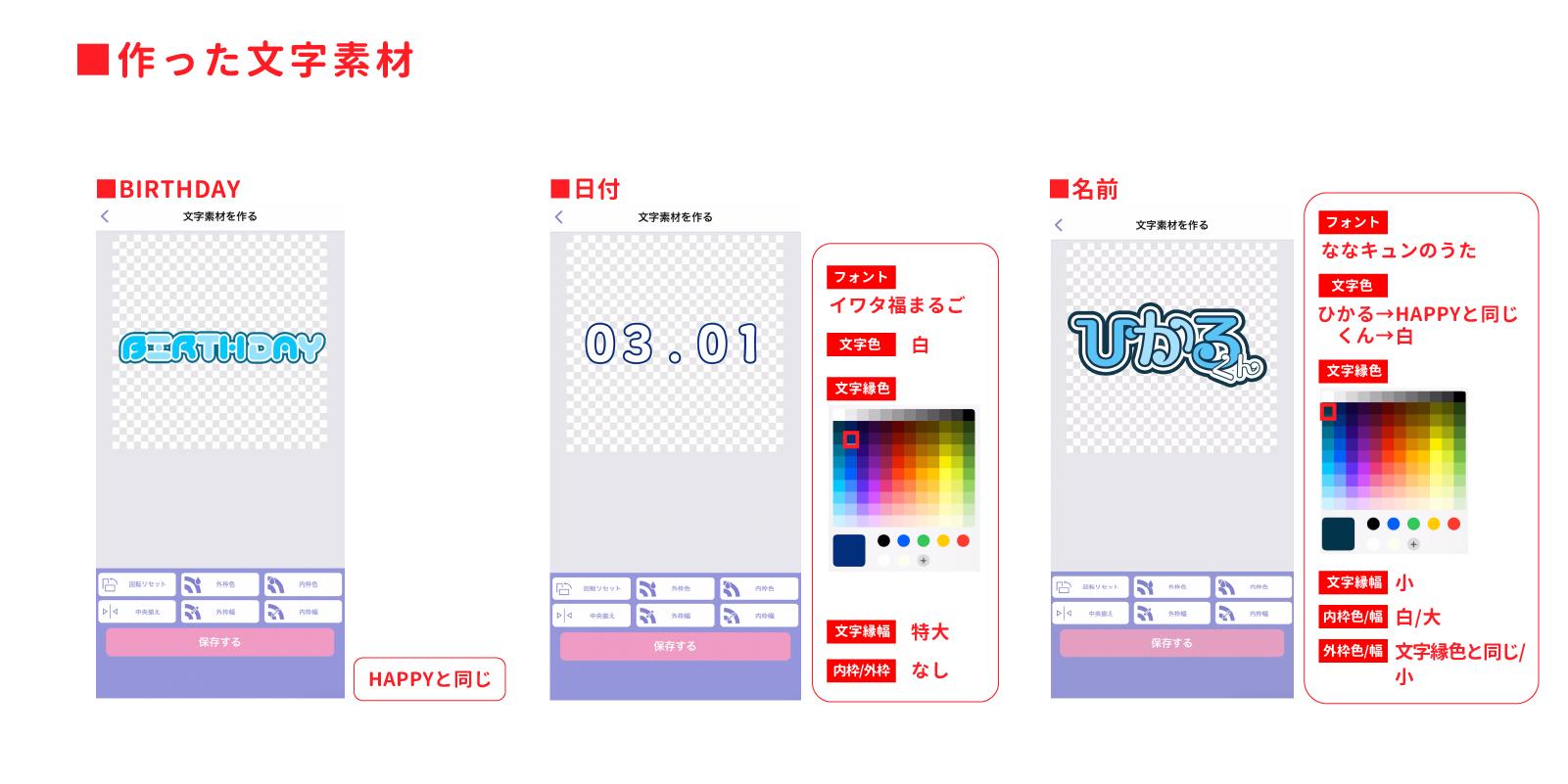 私は他に「BIRTHDAY」「日付」「名前」の3種類の文字素材を追加で作りました♪