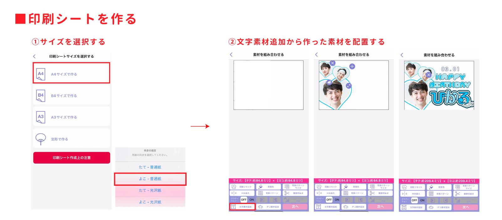 アプリのトップ画面から「印刷シートを作る」でサイズや用紙を選択します。