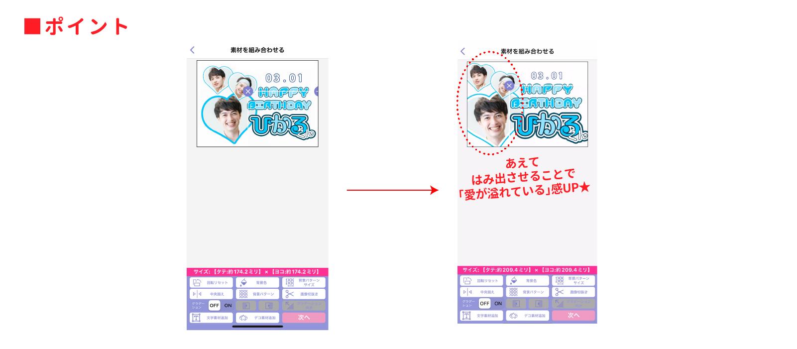 ということで、ハート型画像素材をあえてはみ出させることで溢れてる感を演出しています!★