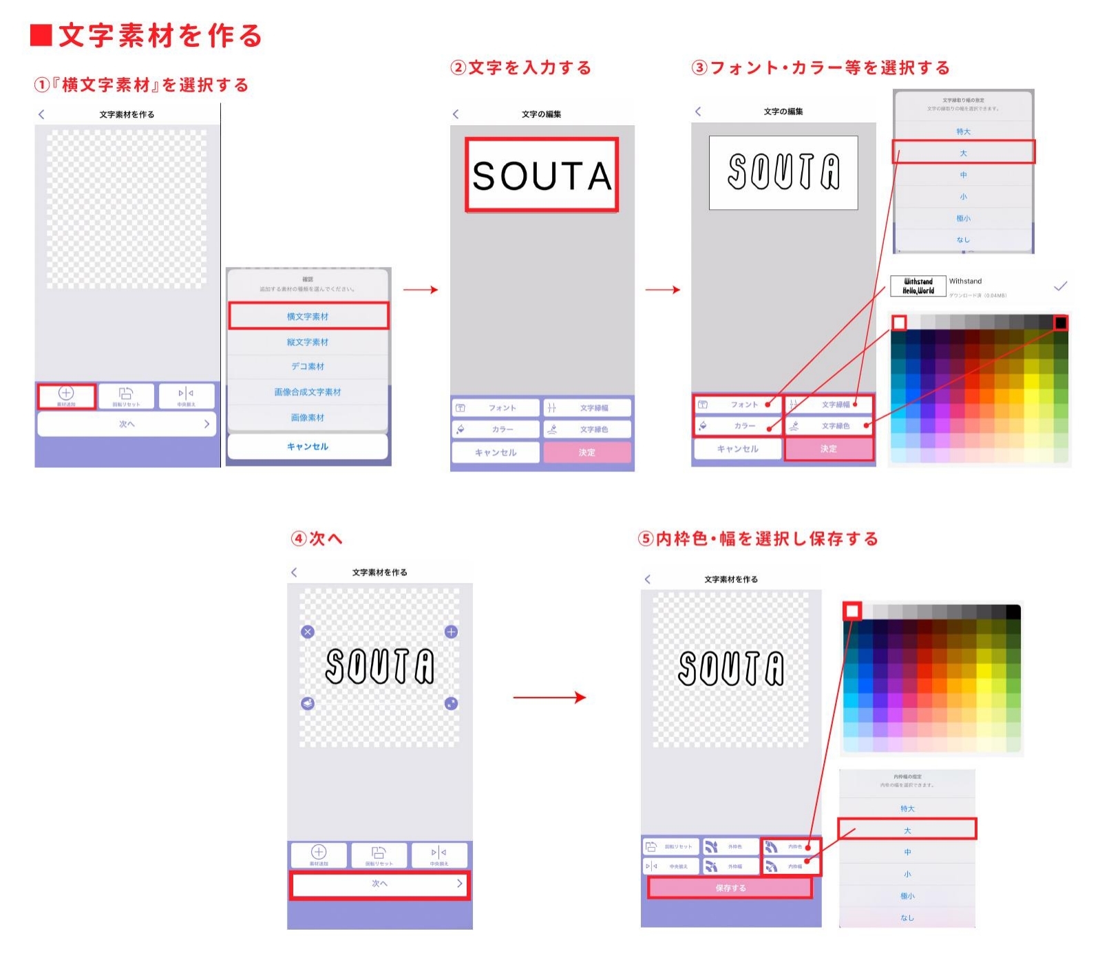 アプリトップの「文字素材を作る」→「文字素材を作る」→編集画面にいきます。