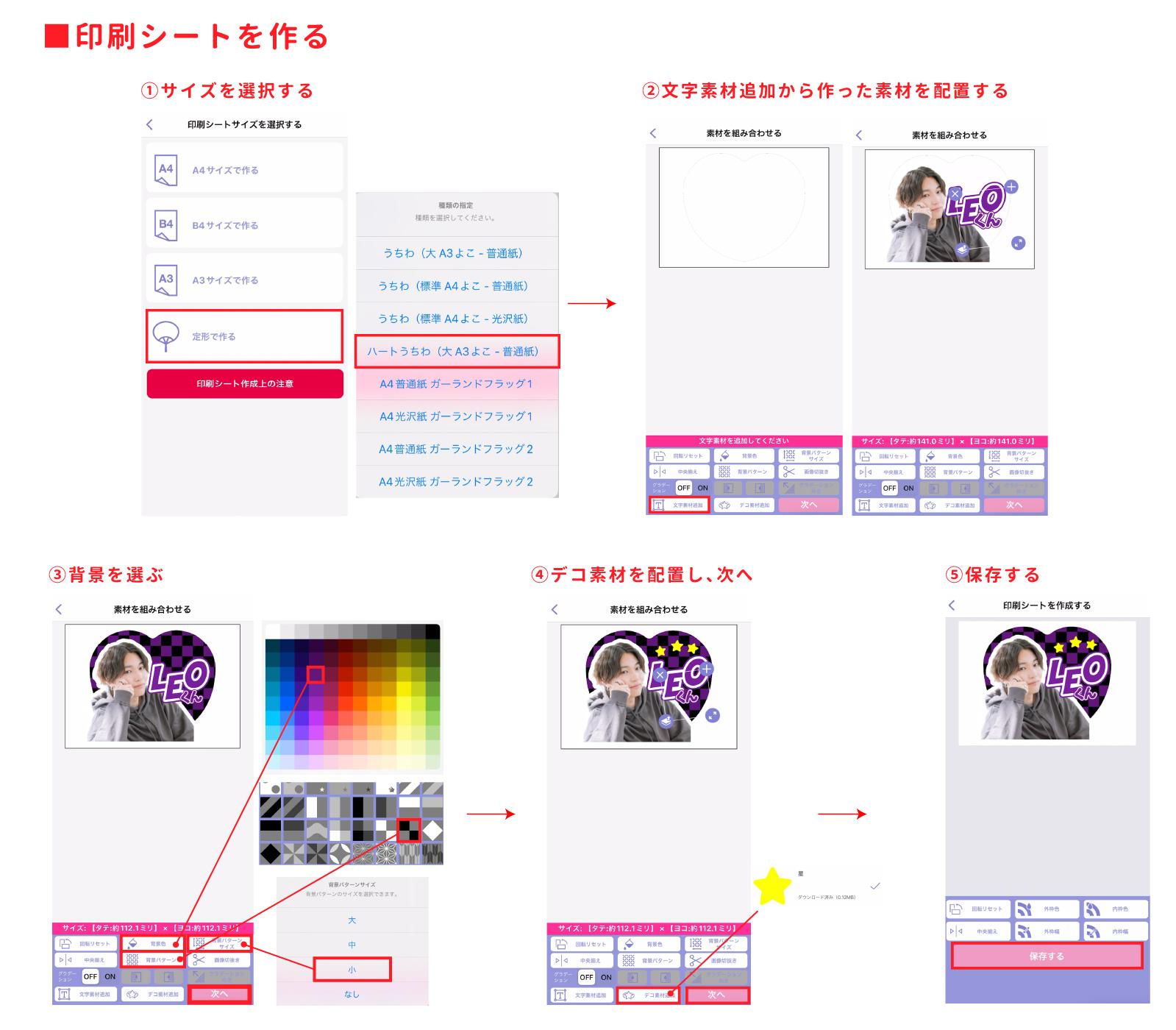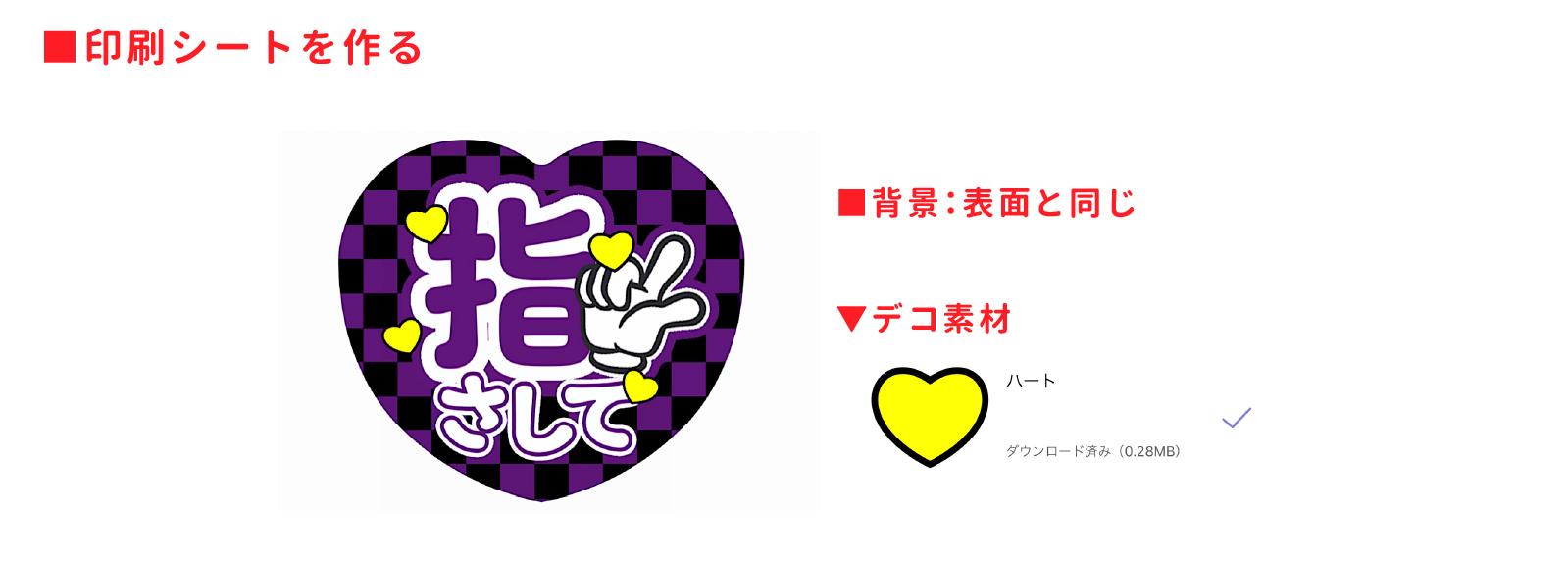 アプリのトップ画面から「印刷シートを作る」→「定形で作る」から「ハートうちわ(大 A3 よこ-普通紙)」を選択します。