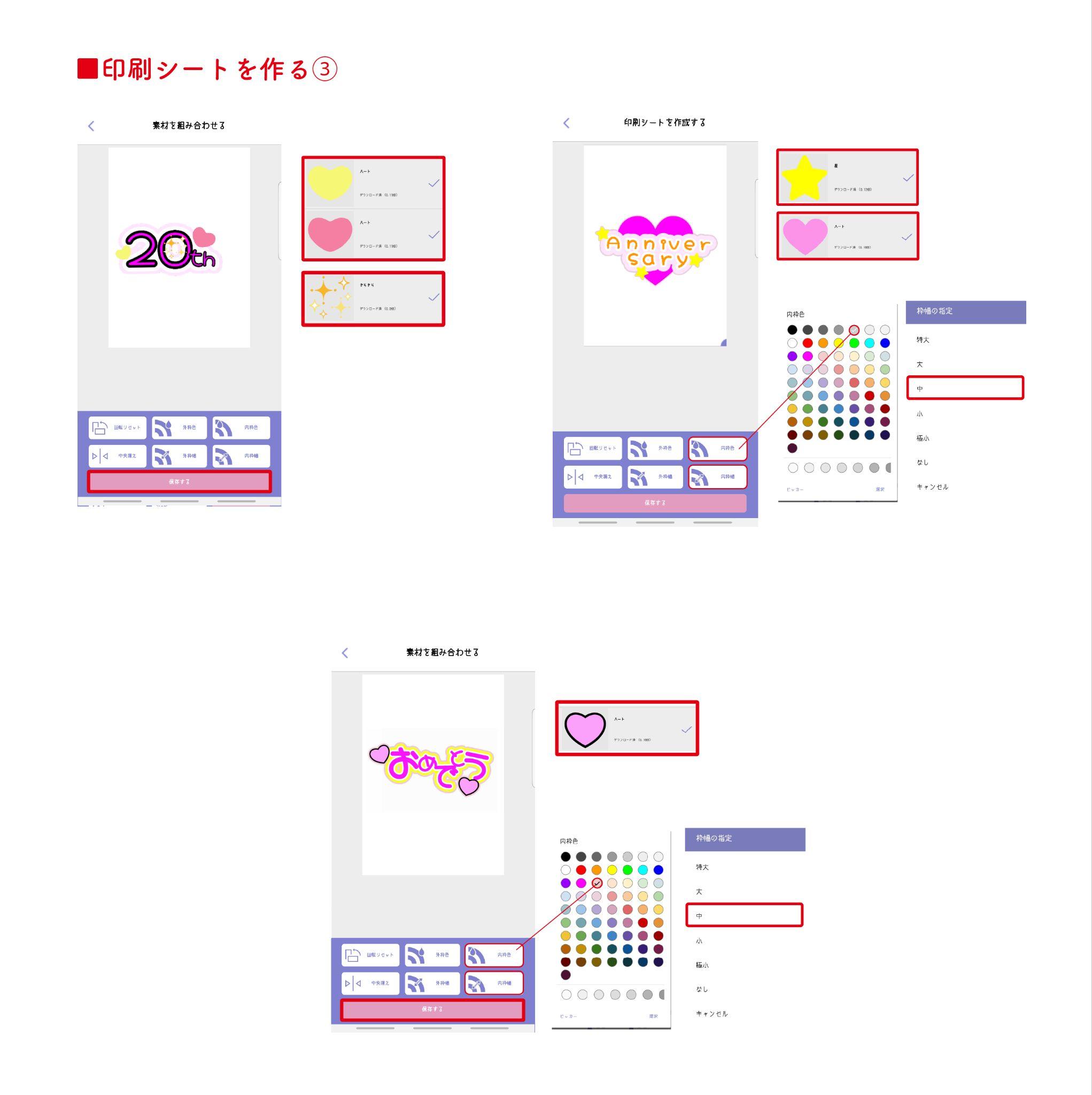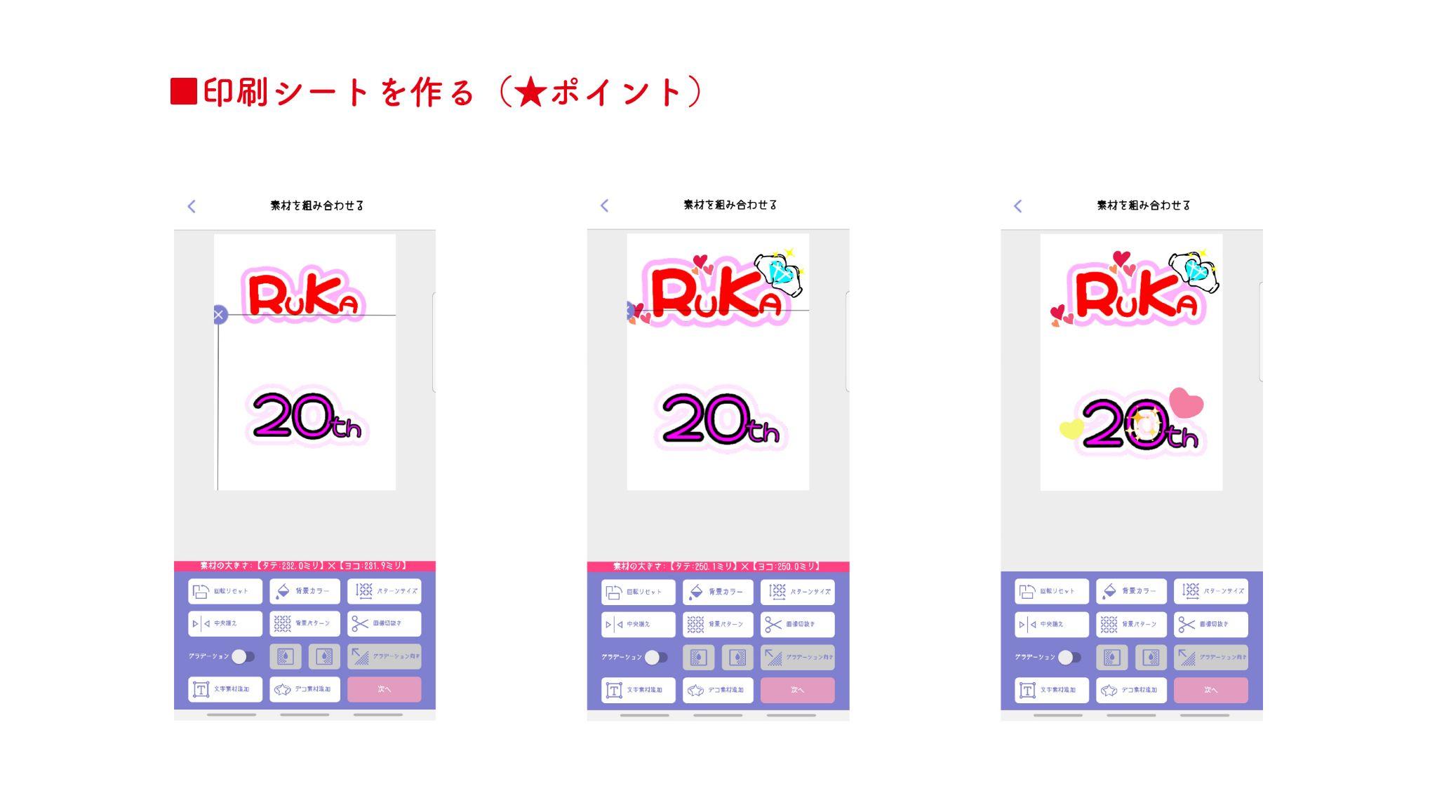 デコ素材配置後も調節が可能なため、選んだ用紙サイズを枠からはみ出さない程度に大きめに配置しましょう♪
