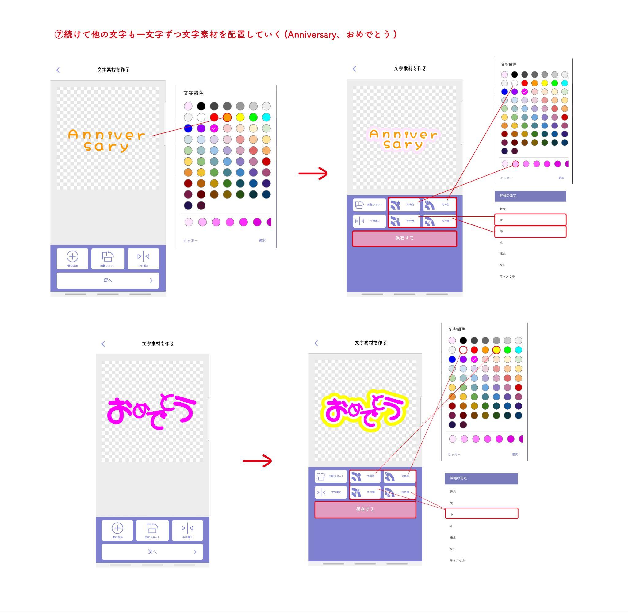 白枠に文字を入力し、下部のボタンからフォント、カラーを選び文字を入力していきます。