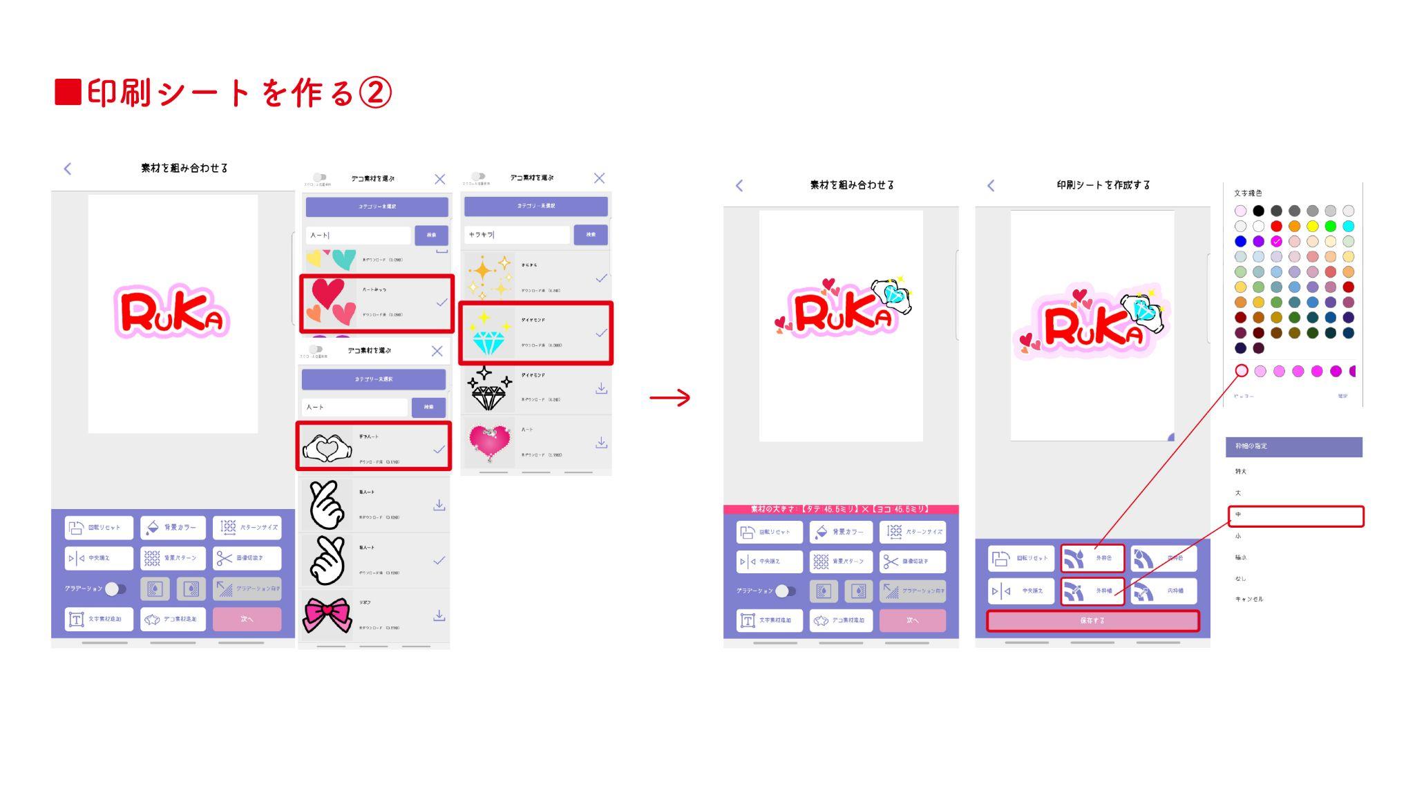 配置した文字素材『RUKA』をデコ素材で装飾していきます。