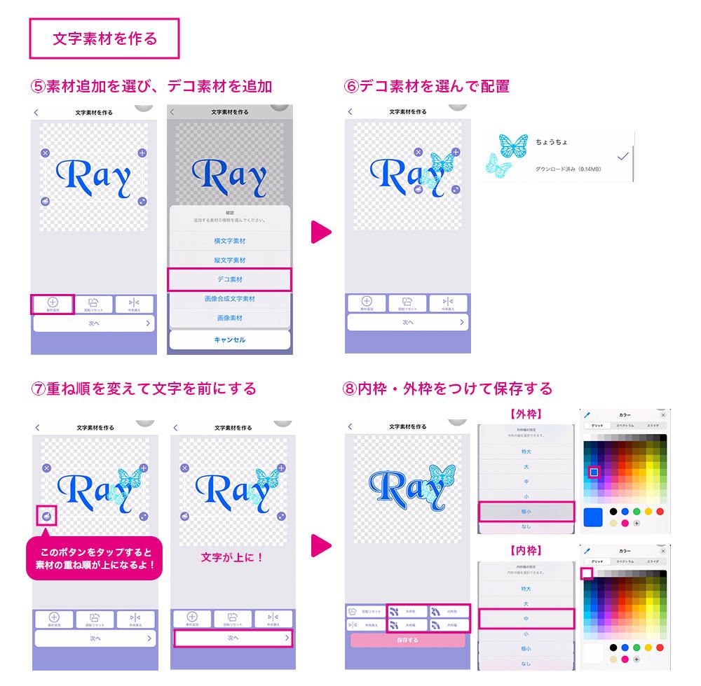 次に『文字素材追加』を選んで作った文字素材と『デコ素材追加』を選んでデコ素材を追加していくよー!