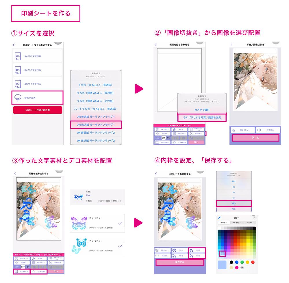 アプリのトップ画面から『印刷シートを作る』でサイズや用紙を選択するよ!
