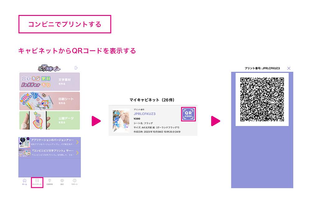 紫色の「QRCODE」ボタンをタップするとQRコードが生成されるので、コンビニのマルチコピー機にかざしたら簡単に印刷ができるよ〜!
