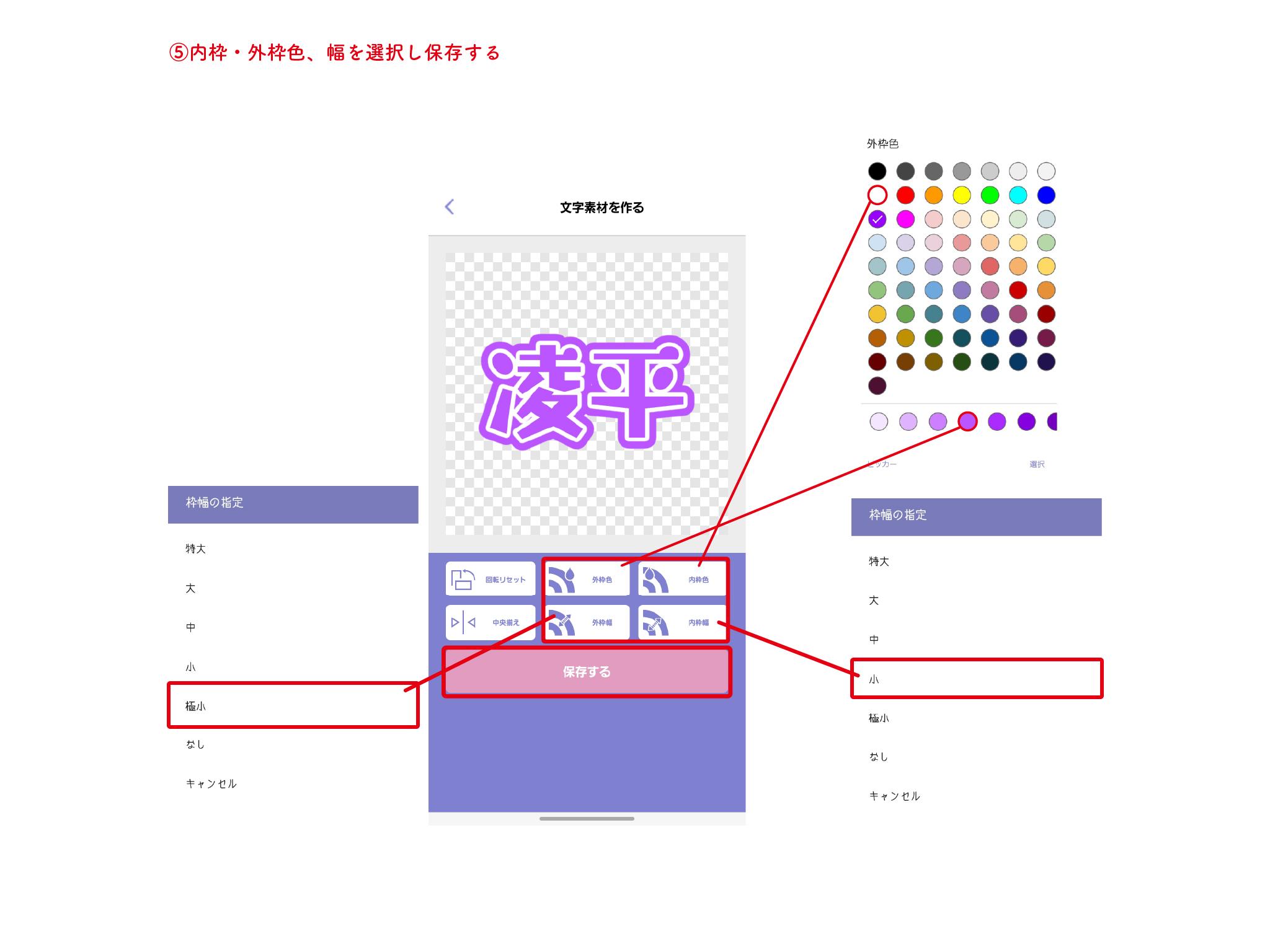 文字の入力が終わったら文字素材の大きさを調整し、次に内枠色・外枠色を選びます。