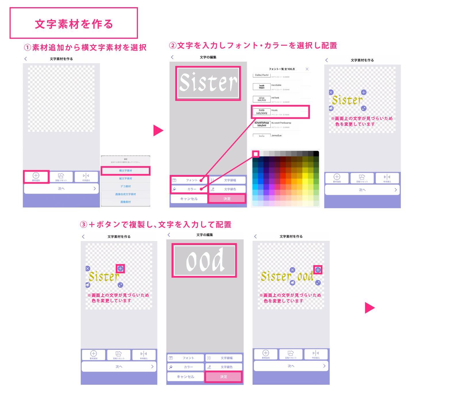 文字入力の画面になったら白い長方形をタップ、「Sister」と入れてフォントとカラーを選ぼう♪