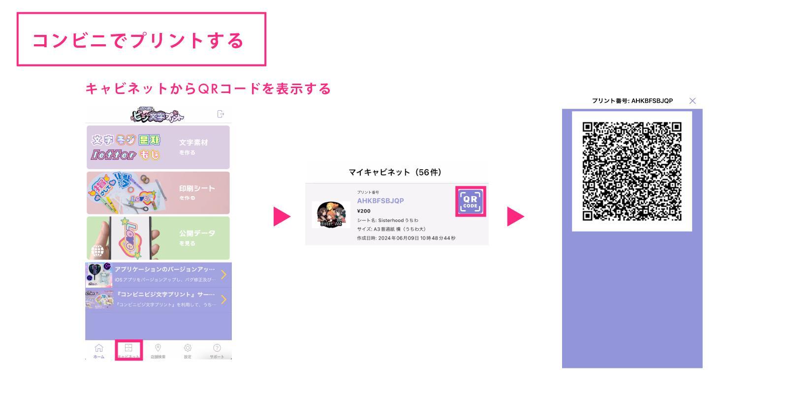 紫色の「QRCODE」ボタンをタップするとQRコードが生成されるので、コンビニのマルチコピー機にかざしたら簡単に印刷ができるよ(๑>◡<๑)