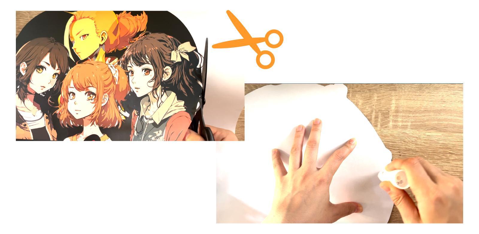 キャラクターの髪の毛とタイトルのところだけはみ出して、他はうちわの線に沿ってカットして、糊や両面テープでうちわに貼り付けたら完成!!