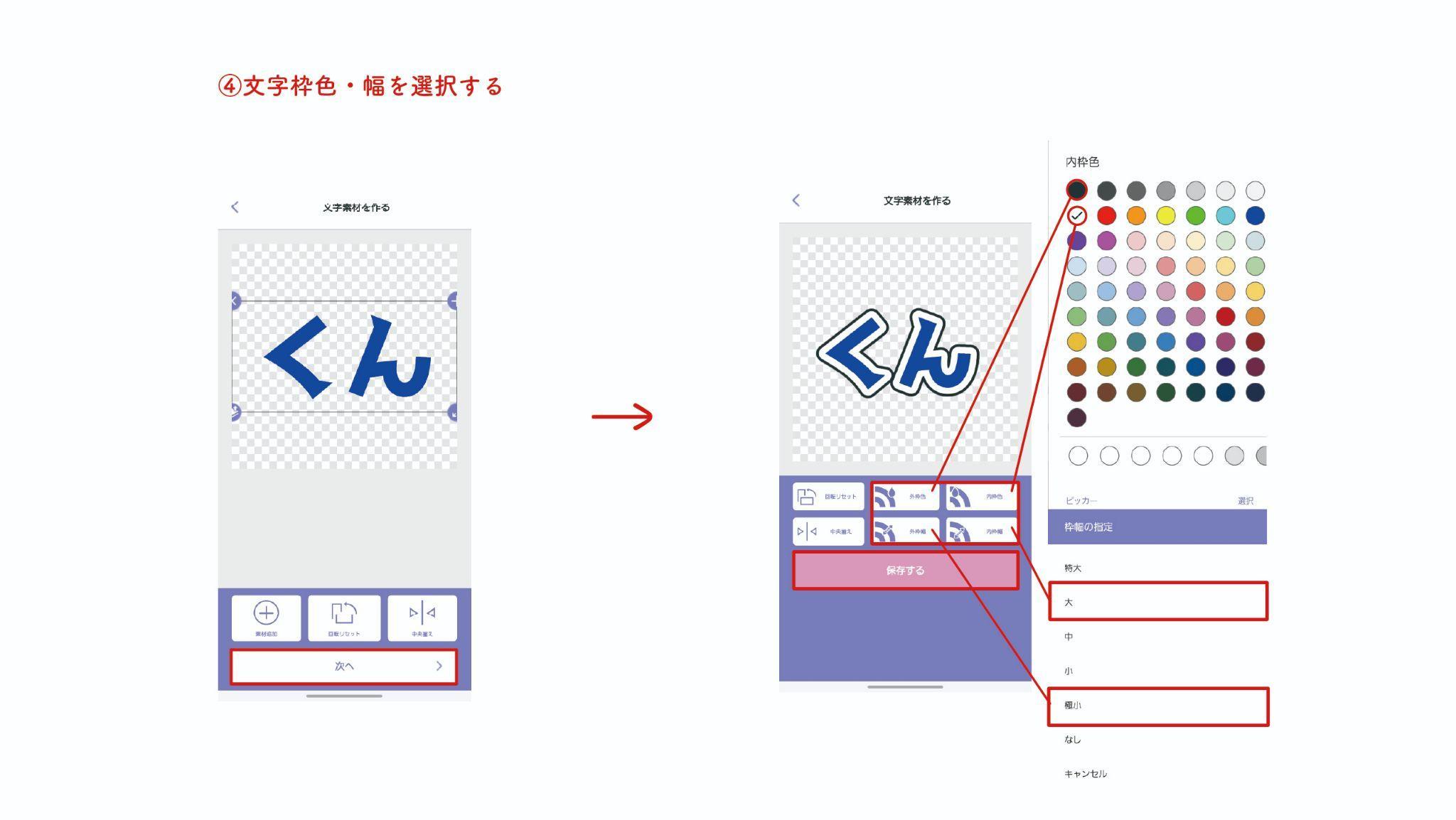 最後に文字素材に、内・外枠色、枠幅の選択をします。