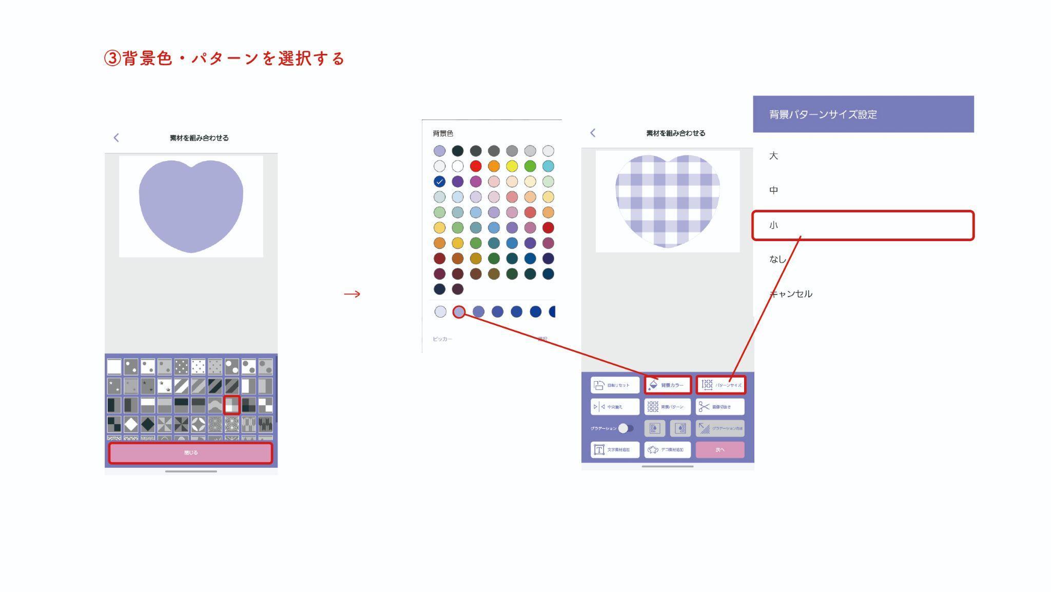 - パターン背景を使用する時は、文字をより際立たせる為にハート等のデコ素材を活用しよう