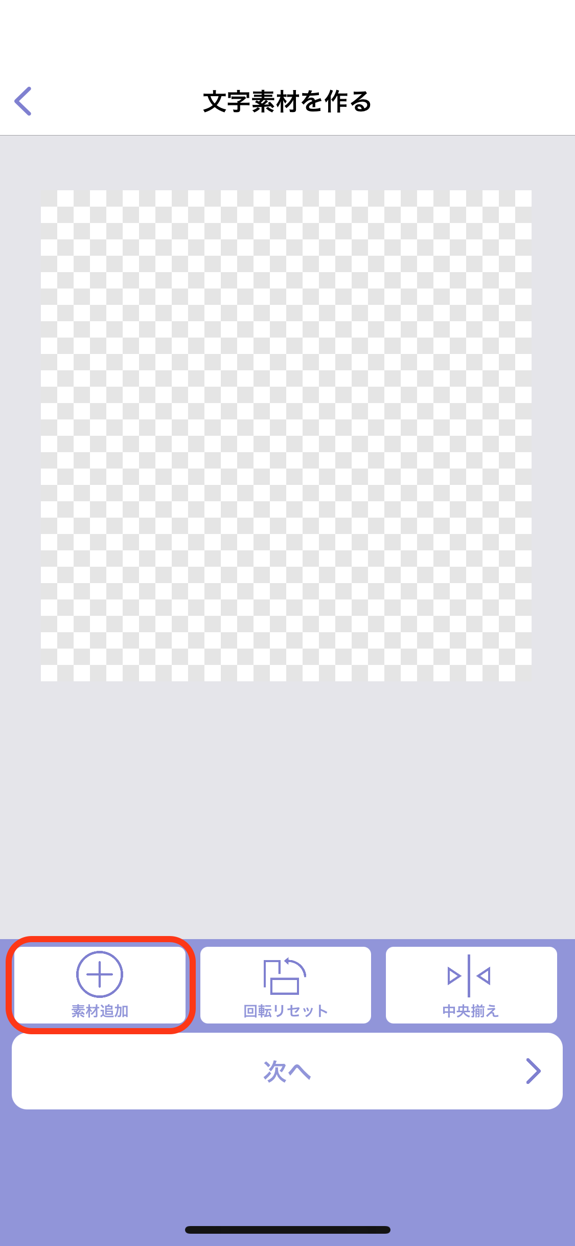 「文字素材を作る」をタップして次の画面へ進み、「文字素材を作る」をタップします。