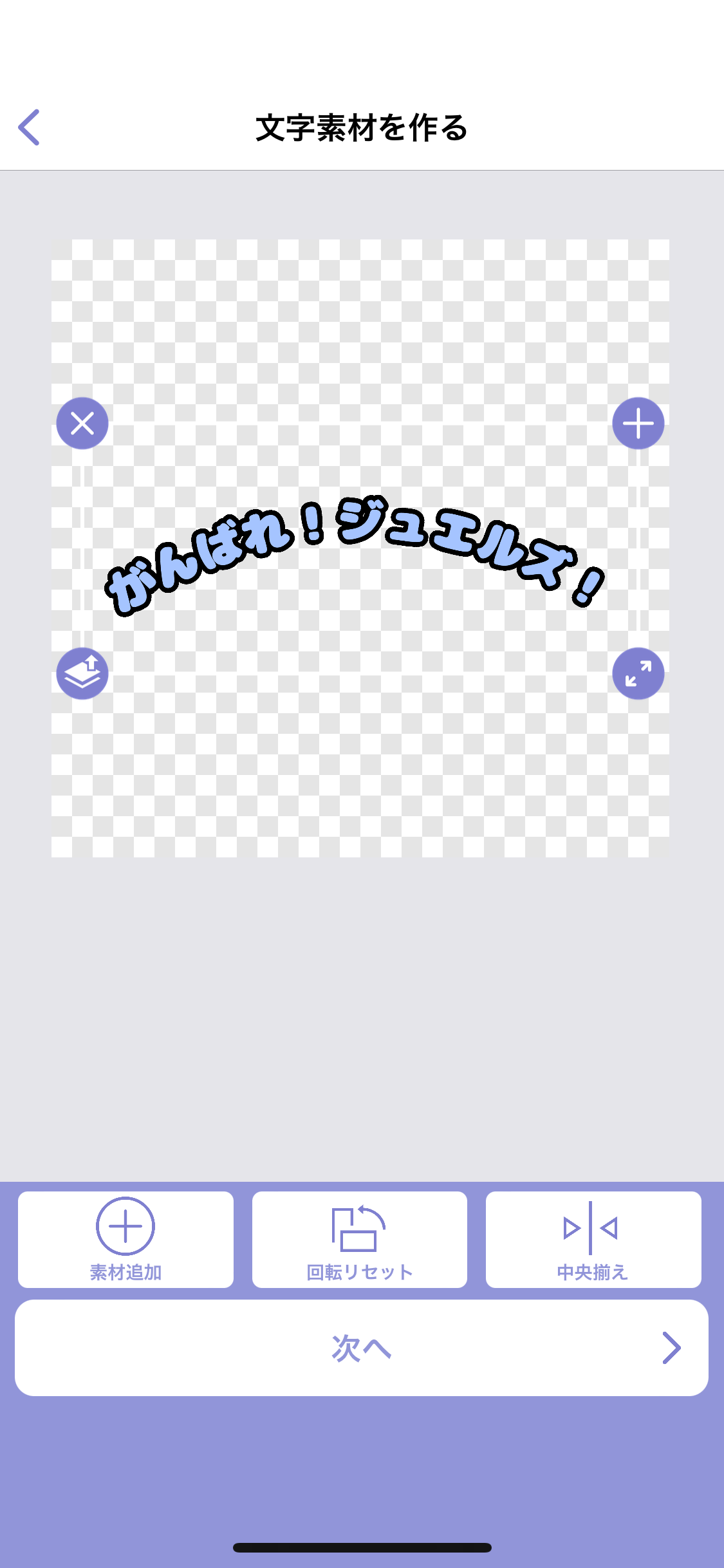正方形の枠の中央に「夢」という「画像合成文字」が表示されてますので、お好きなサイズに指二本を使ってサイズや位置の調整を行って「次へ」をタップして、素材として保存する最終画面へ移動します。