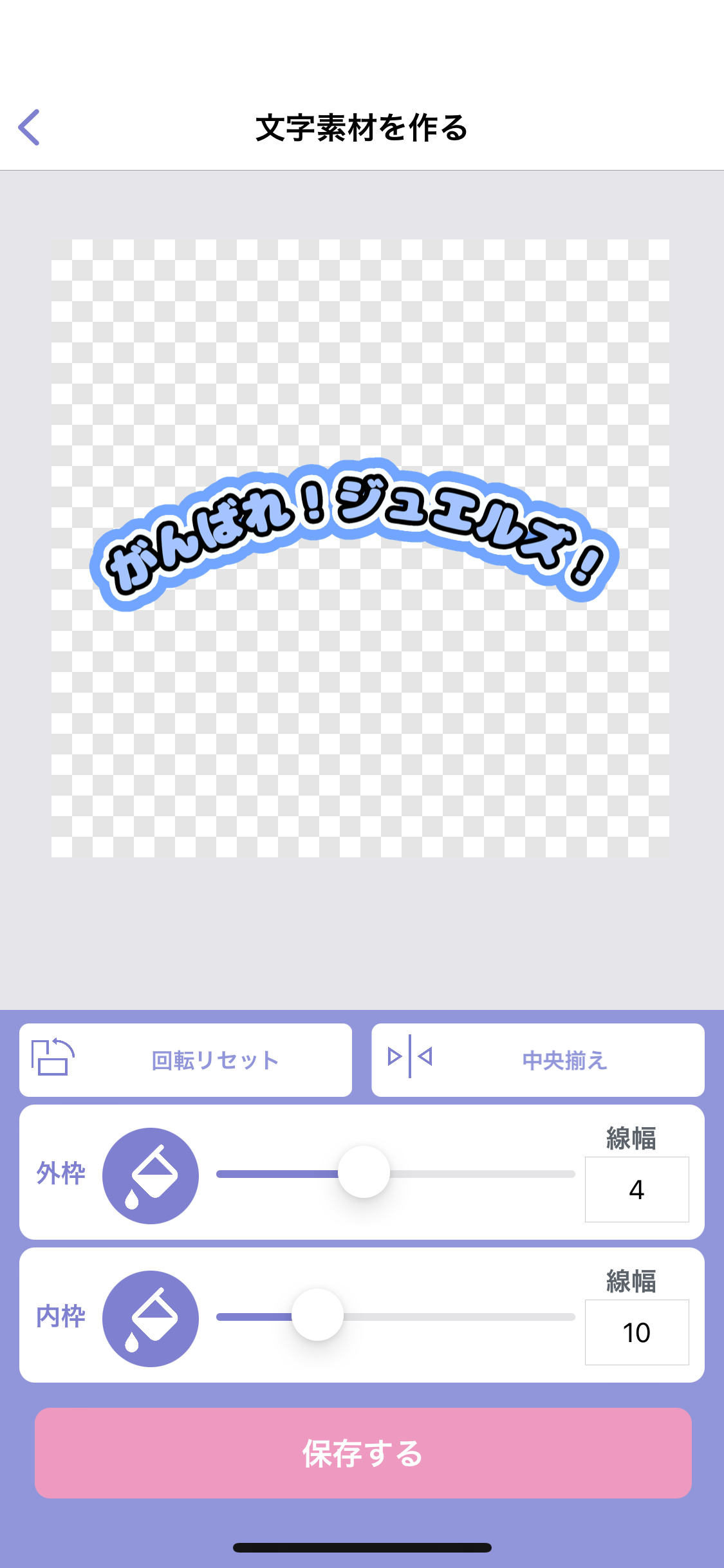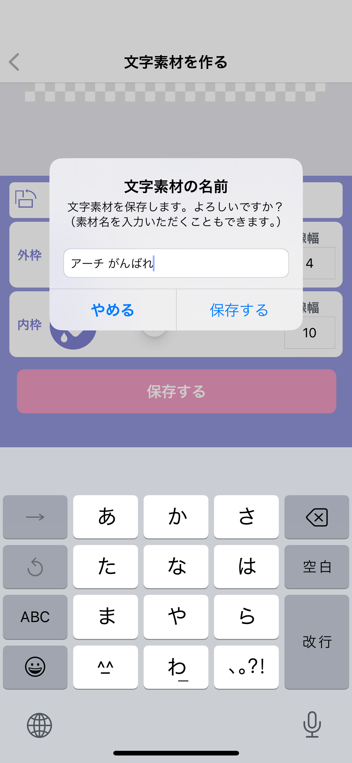 縁取りの調整が終わったら「保存する」をタップして文字素材の完成に向けて操作を続けていきます。