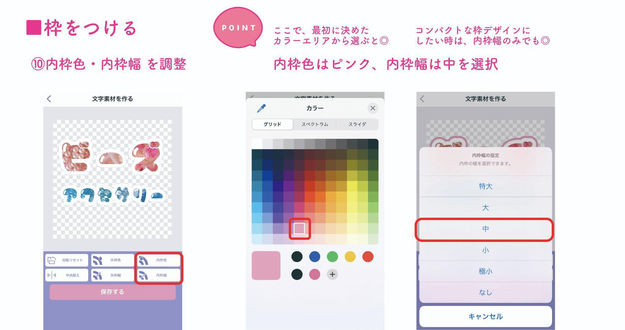 「文字枠」「内枠」「外枠」最大3つも色枠をつけることができるんです♪
