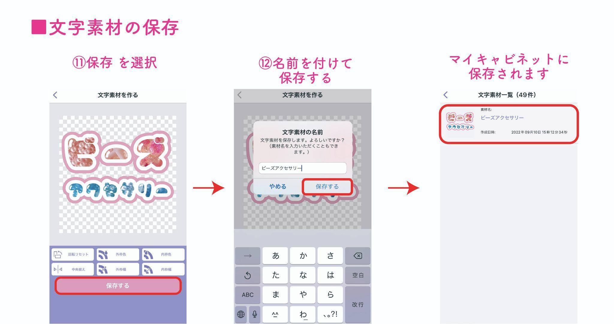 文字素材同様、名前をつけて保存をすると マイキャビネットに保存されます。