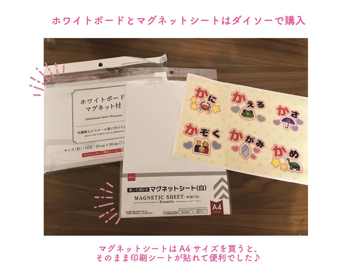 ちなみに、材料はこちら!マグネットシートもホワイトボードも、ダイソーで購入できますよ。