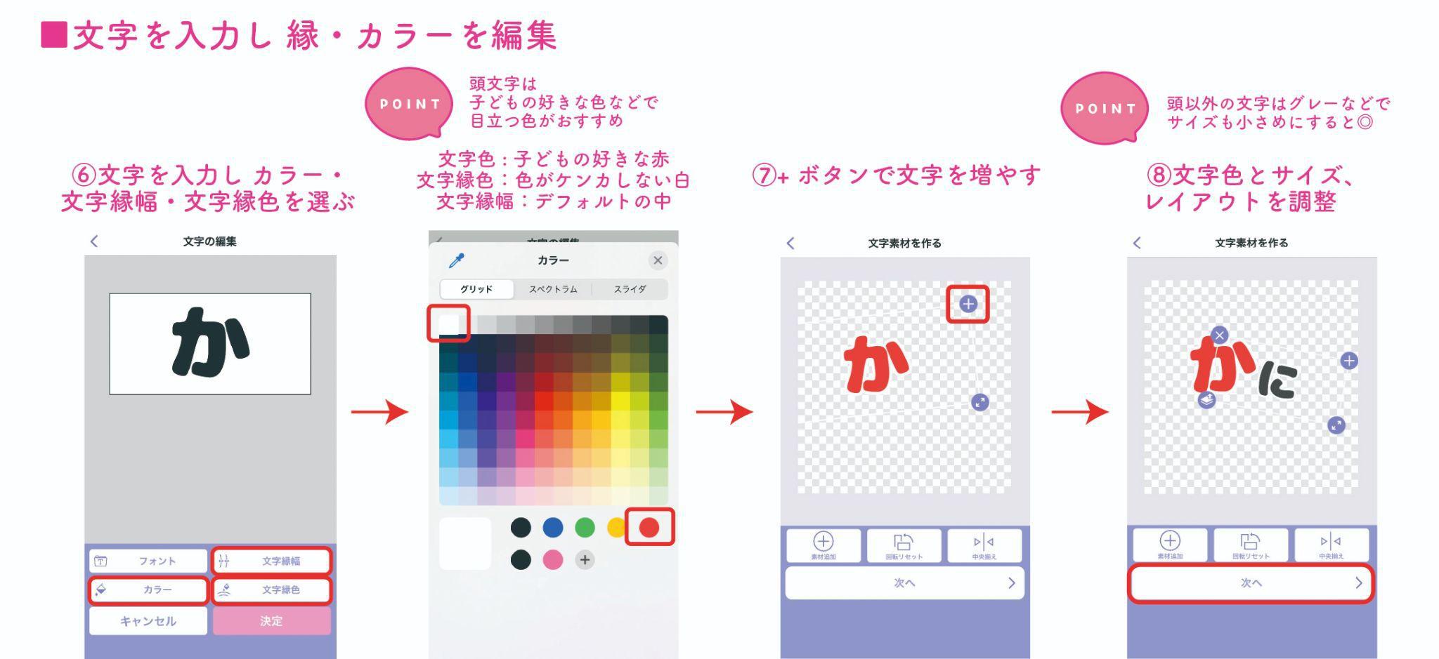 - ひらがなは頭文字だけ目立つ色とサイズにするのがおすすめ♪