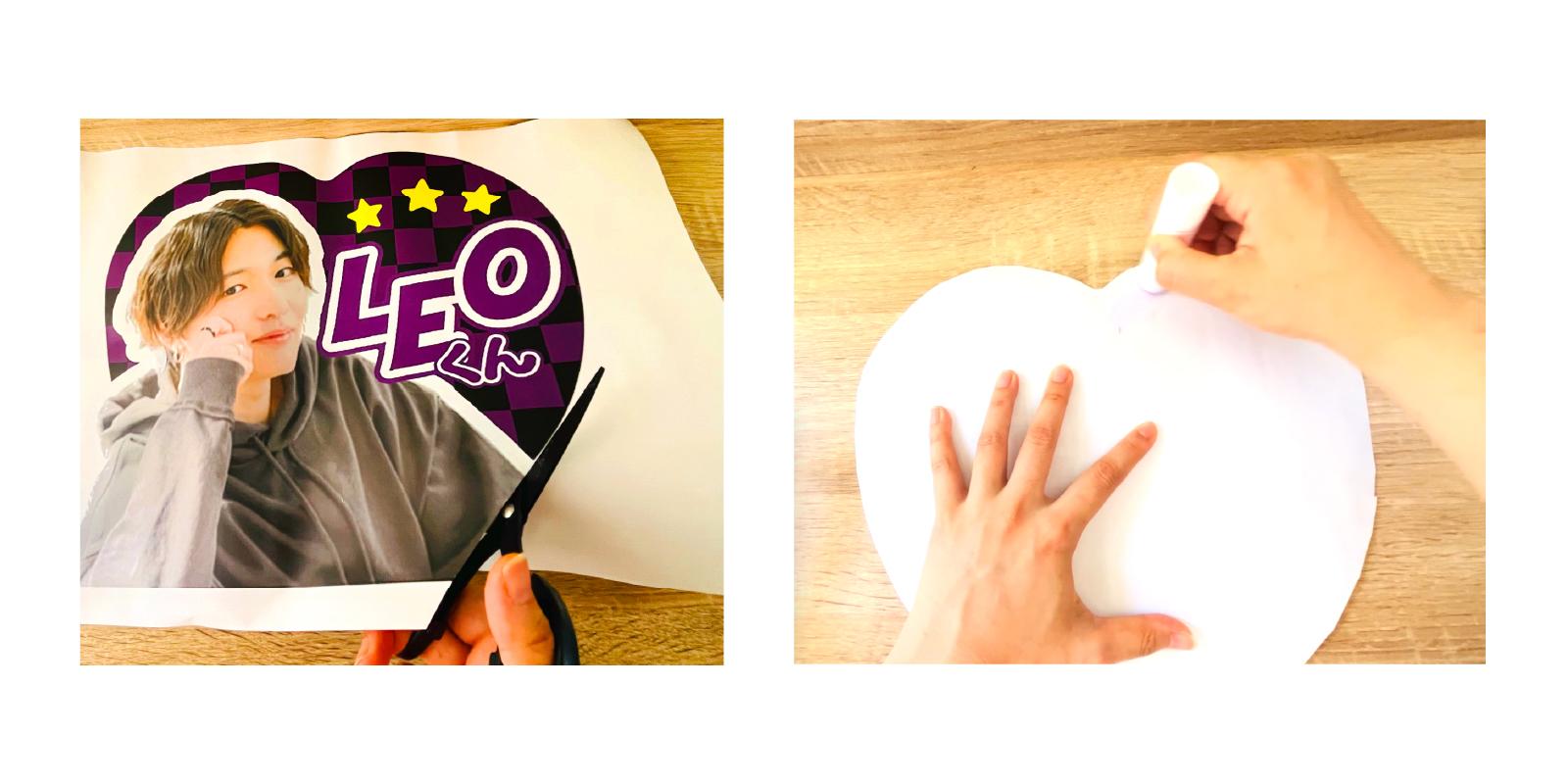 作った2枚分を印刷をしたらハートの線に合わせてハサミでカットして、100均の「ハートうちわ」に貼ります!