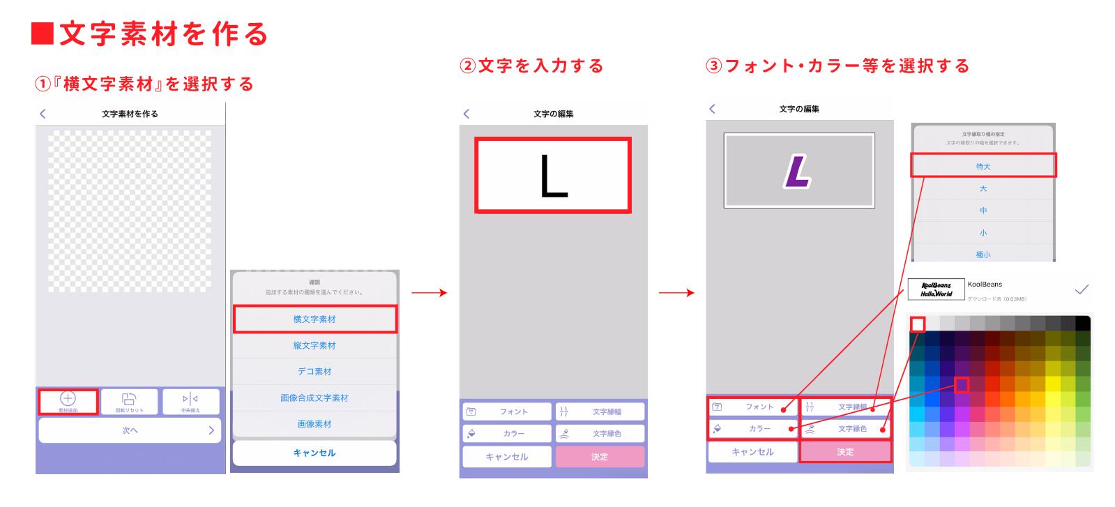 アプリのトップ「文字素材を作る」→「文字素材を作る」→編集画面の「素材追加」から「横文字素材」を選択します。