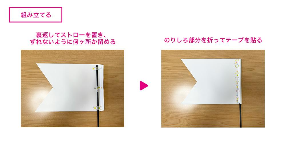 最後にストローを巻き込むようにのりしろ部分を折って、上からテープで留めたらオリジナルフラッグの完成だよー。゚+.( °∀°)゚+.゚