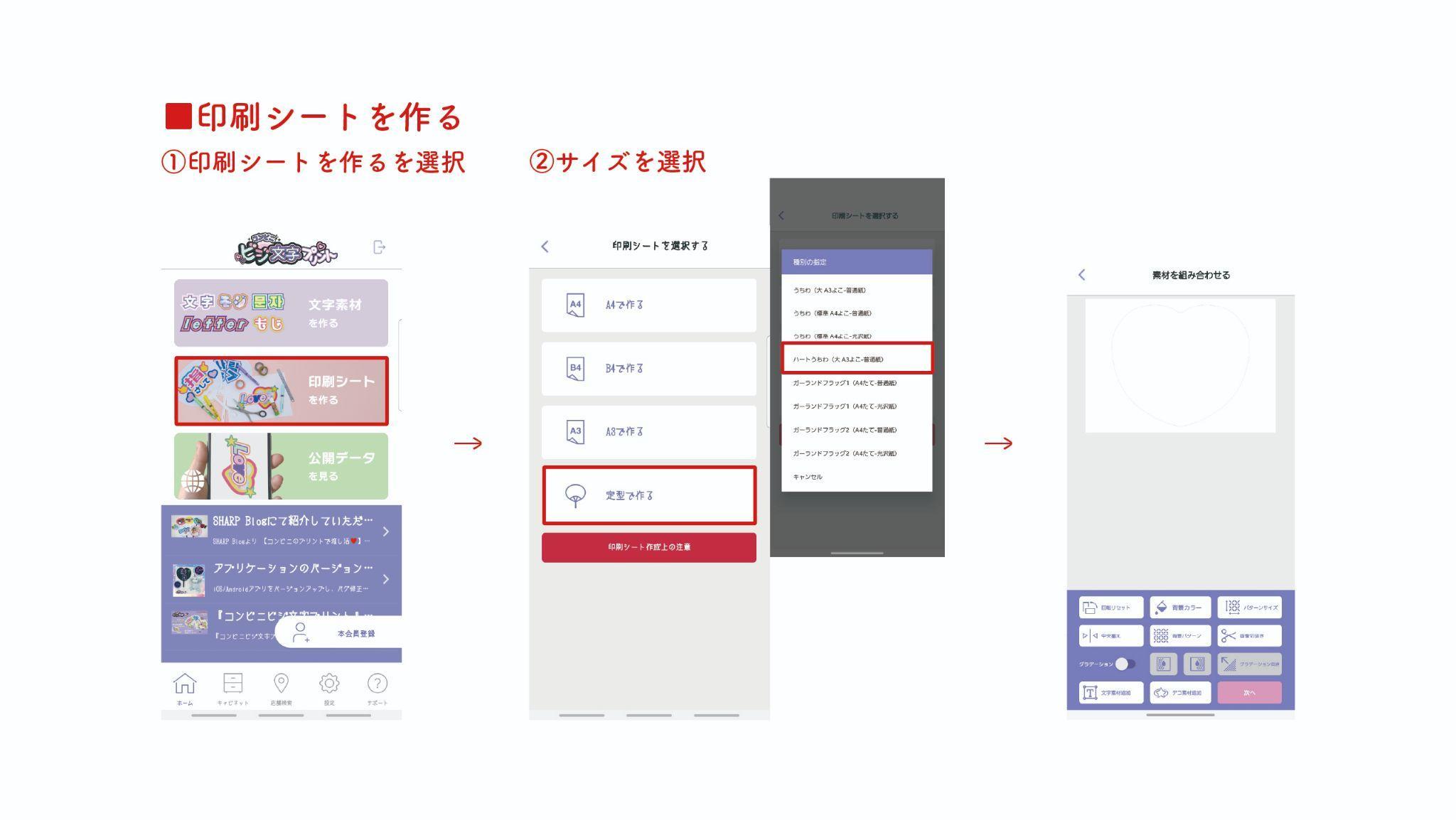 アプリのトップ画面から『印刷シートを作る』→『定型で作る』を選択。