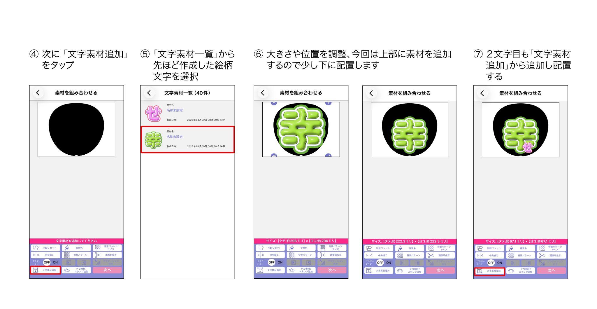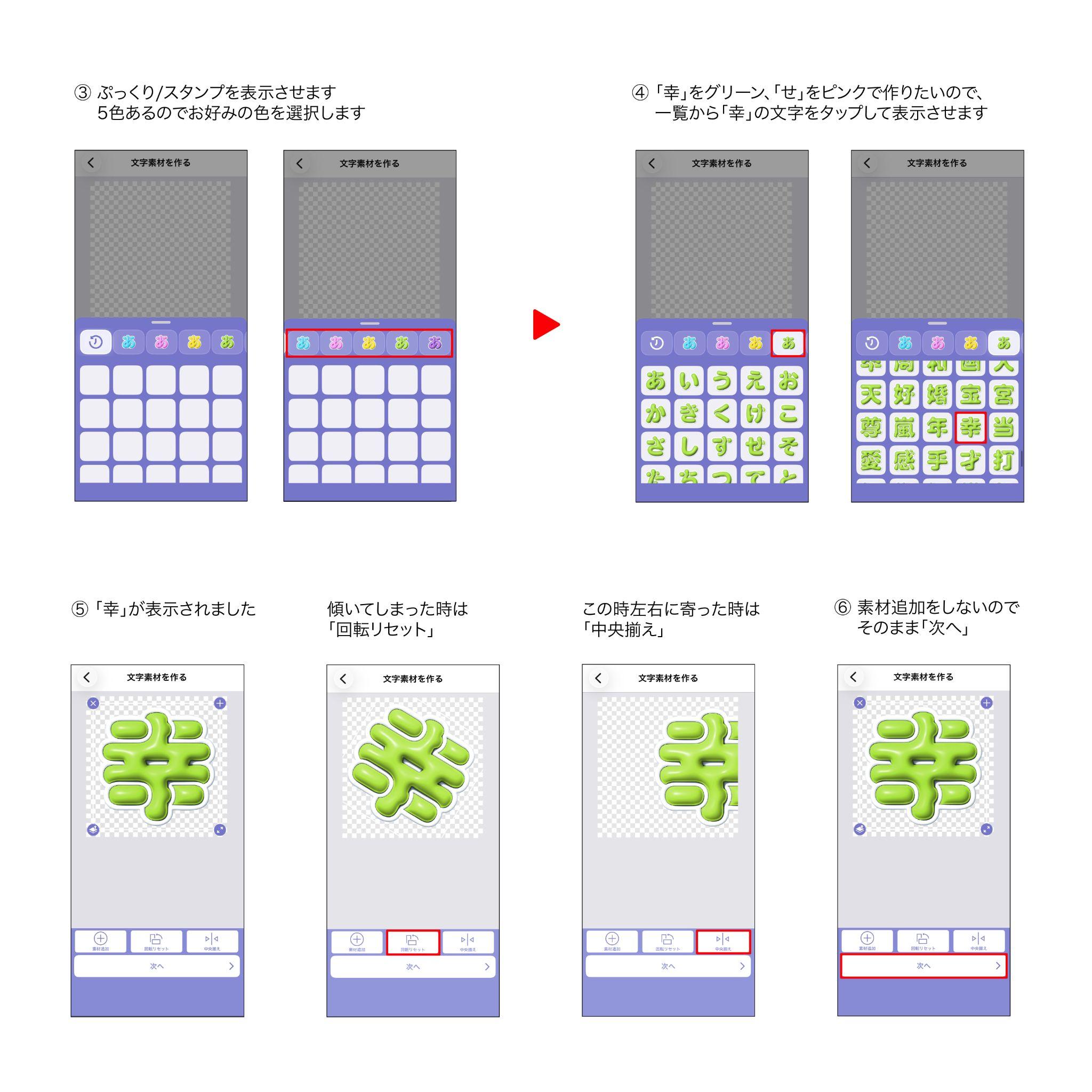 配置が決定したらもう一度『文字素材追加』をタップし、2文字目の『せ』を選択します。