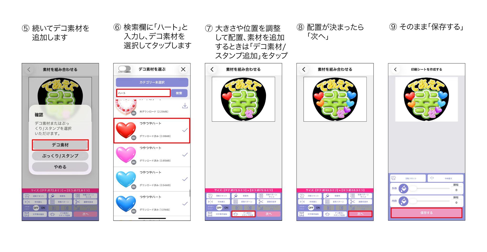 デコ素材の内枠・外枠も設定できるのですが、文字素材やハートをうちわのサイズギリギリの位置に配置したのでそのまま『保存する』をタップし名前をつけて保存します。