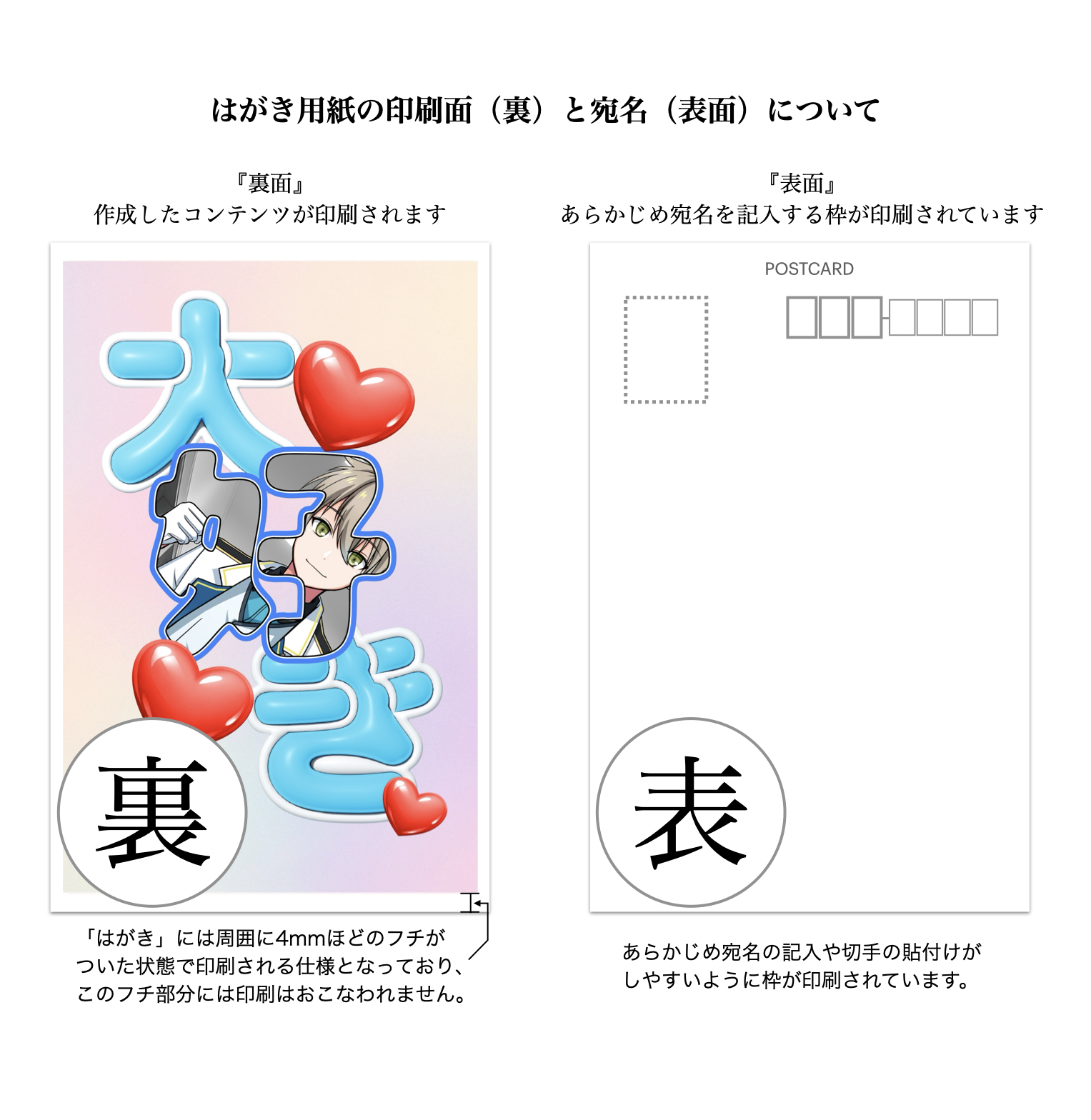 またプリントしたハガキは官製ハガキや年賀ハガキではなく、ご自身で切手を貼っていただく私製ハガキ用紙となります。