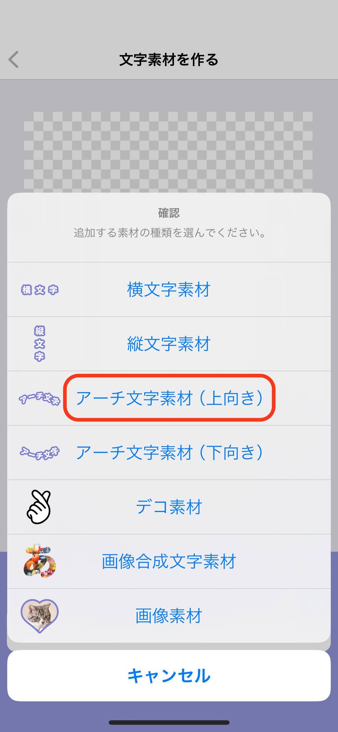 ここでは、「素材追加」をタップして文字の追加や、文字の形に画像を切り抜いた画像合成文字素材、デコ素材というあらかじめ提供されている画像素材も組み合わせて 「文字素材」の作成ができます。