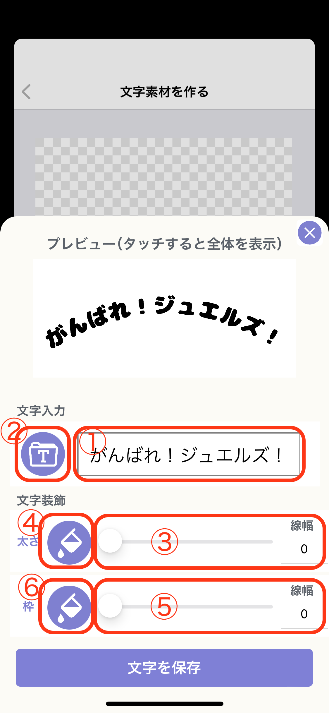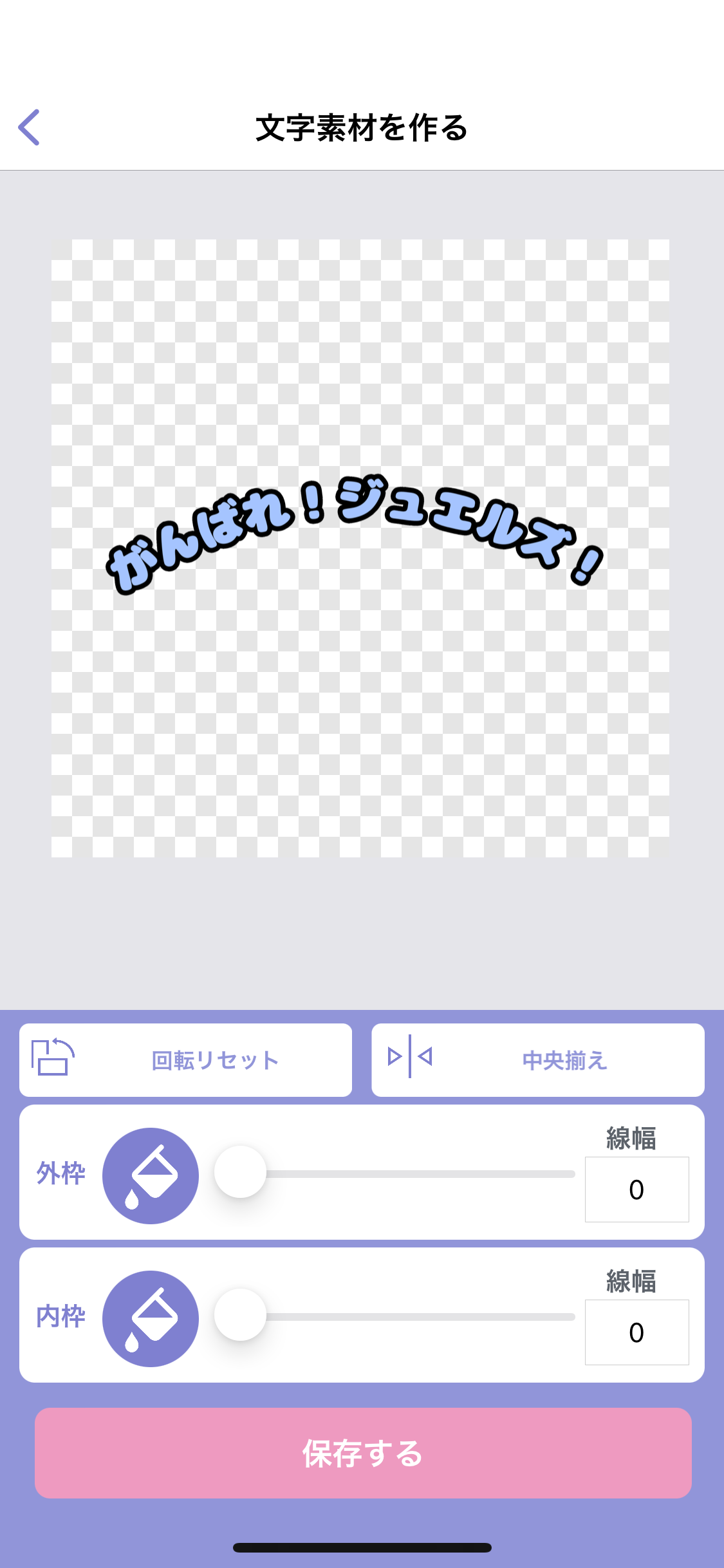縁取りの調整が終わったら「保存する」をタップして文字素材の完成に向けて操作を続けていきます。