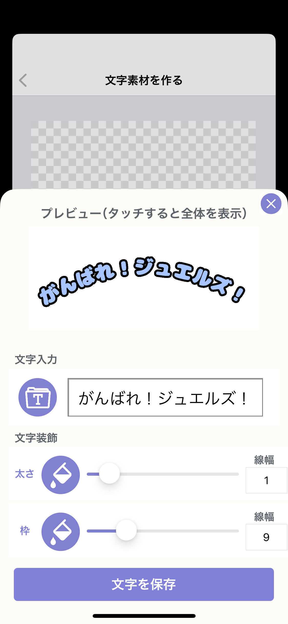 「保存する」をタップした際に、この「がんばれ!ジュエルズ!」文字自体に名前をつけて保存することができます。(名前をつけなくても保存は可能です。)