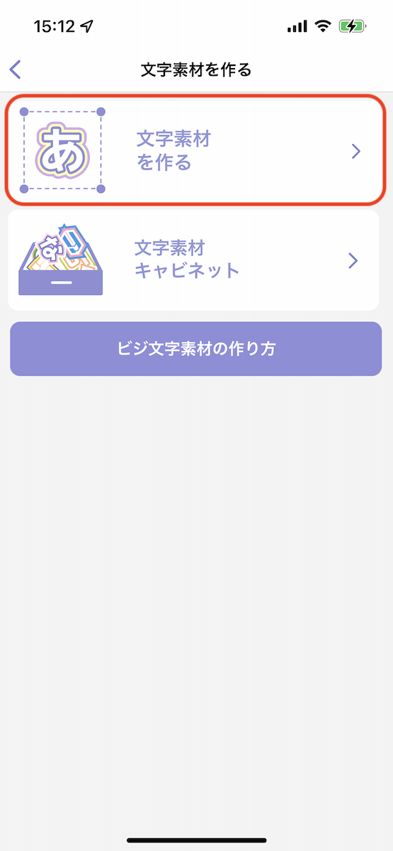 「文字素材を作る」をタップして次の画面へ進み、「文字素材を作る」をタップします。